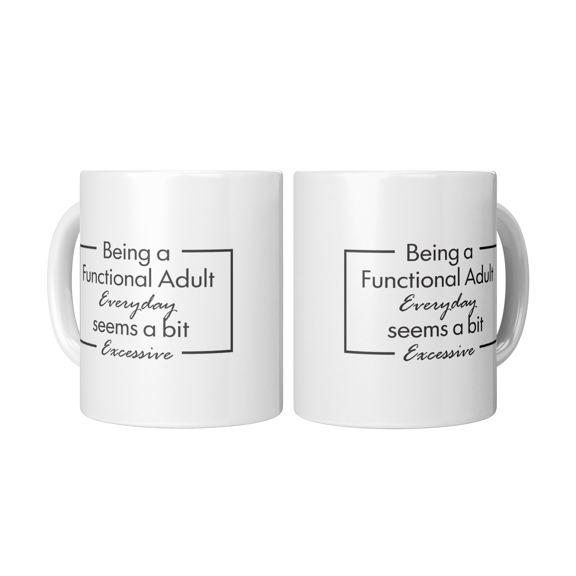 Add humor to your daily grind with our Being a Functional Adult Mug! Featuring the witty quote: “Being a functional adult every day seems a bit excessive,” this 11 oz ceramic coffee cup is perfect for those who need caffeine to survive adulting. Ideal for coffee, tea, or cocoa, it makes a great gift for friends, coworkers, or anyone who loves a good laugh with their morning brew.